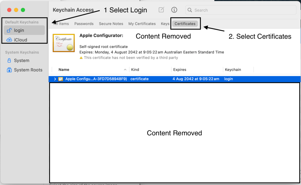 Choose Login, then the certificates tab, and Choose the certificate labelled Apple Configurator.